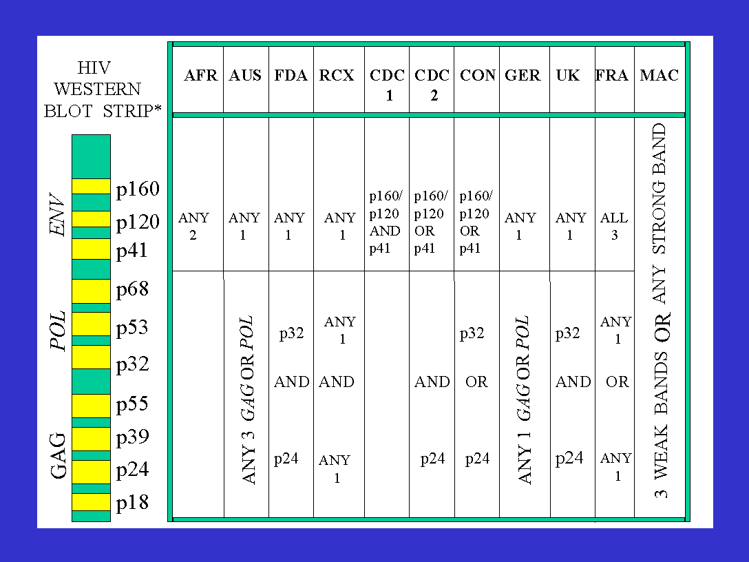 NOTE: Each horizontal band on the left represents a protein with which an antibody can react. Serum from a patient is added to a strip and the strip developed. Where there have been antibodies reacting a dark band occurs. The number and location determining a positive test, for the same virus, varies all over the world. Even today there are still no internationally agreed criteria as to what constitutes a positive WB. This gives rise to the bizarre situation where, for example, an individual positive in New York City on the CDC criteria would not be positive in Sydney, Australia. Or an Australian positive with p41, p32, p24 and p18 bands would not be positive in Africa. Or an African positive with a p41 and p120 band would not be positive in Australia, parts of the US or Europe. Confusion over antibody reactivity is confirmed in diagnostic laboratory manuals. The Genelabs Diagnostic HIV BLOT 2.2 Western blot Assay Instruction Manual advises, "Specific guidelines for interpretation may differ depending on the local policies, GENELABS recommends following the accepted policy to be in accordance with local regulations". This is followed by seven different criteria for defining a positive Western blot issued by "different international regulatory bodies". Genelabs also append, "We recommend the following guidelines for the interpretation of the Genelabs Diagnostic HIV BLOT 2.2" and list an eighth set of criteria for a positive Western blot. This means that "different international regulatory bodies" or "local policies", and not the presumed pathogen determine patterns of antibody reactivity said to prove a retroviral infection. Manufacturer Bio-Rad advises "Each laboratory performing Western blot testing should develop its own criteria for band interpretation. Alternatively, band interpretation may be left to the clinician" (Bio-Rad Laboratory Manual 1993).